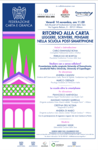 La Federazione Carta e Grafica è per il dodicesimo anno consecutivo in BookCityMilano. Venerdì 14 novembre, alle ore 11, nella Sala Buzzati della Fondazione Corriere della Sera, a Milano, si parla di apprendimento, di scuola, di uso appropriato del digitale.
