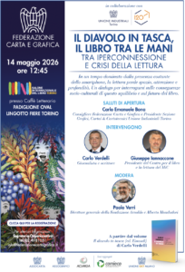 Il diavolo in tasca, il libro fra le mani”: è il titolo dell’incontro che la Federazione Carta e Grafica organizza per l’imminente Salone Internazionale del Libro di Torino. Vedrà protagonisti il giornalista Carlo Verdelli e il presidente del Centro per il libro e la lettura del Ministero della Cultura Giuseppe Iannaccone, moderati dal direttore della Fondazione Mondadori Carlo Verri. Appuntamento nella giornata inaugurale del Salone, giovedì 14 maggio (ore 12.45, nella prestigiosa sala del Caffè letterario Lavazza).
