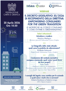 È in programma il 20 aprile prossimo il webinar “Le modifiche al Codice del Consumo e come evitare il Greenwashing”, organizzato dalla Federazione Carta e Grafica. Focus dell’incontro, la responsabilizzazione dei consumatori per la transizione verde mediante il miglioramento della tutela dalle pratiche sleali e dell’informazione, a seguito della pubblicazione in Gazzetta Ufficiale, lo scorso 9 marzo, del Decreto legislativo 20 febbraio 2026, n. 30, in attuazione della direttiva (UE) 2024/825 del Parlamento europeo e del Consiglio, del 28 febbraio 2024, che modifica le direttive 2005/29/CE e 2011/83/UE.